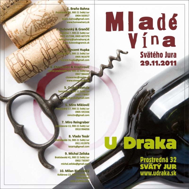 U DRAKA (Proistredná 32 Svätý Jur), na ktorej sa Vám predstaví 10 vinárstiev a vinárov nášho mesta. Čaká na Vás 23 vzoriek toho najlepšieho, čo sa vo svätojurských viniciach toho roku urodilo.