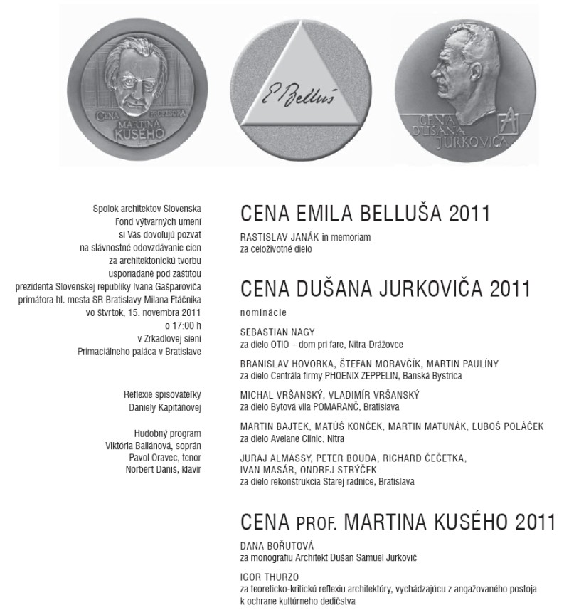 Od Spolku architektov Slovenska sme dostali ponuku prezentovať svätojurské vína na udeľovaní prestížnych cien za architektúru – Cena Emila Belluša 2011, Cena Dušana Jurkoviča 2011 a Cena Prof. Martina Kusého 2011. Udeľovanie cien sa uskutočnilo 15. novembra 2011 v Zrkadlovej sieni Primaciálneho paláca v Bratislave.
