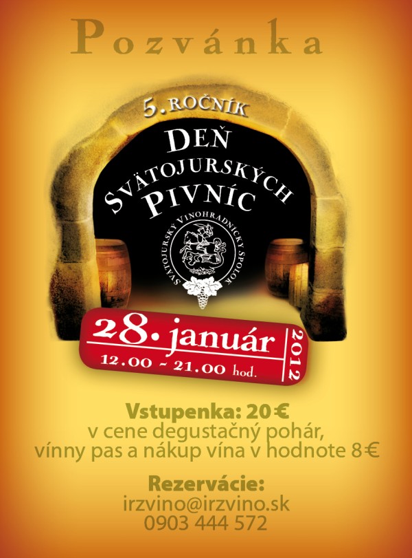 dňa 28. 1. 2012 na 5. ročník Dňa svätojurských pivníc, ktorý pre Vás pripravuje Svätojurský vinohradnícky spolok a mesto Svätý Jur. Od 12:00 do 20:00 hod pre Vás otvoríme 17 pivníc.