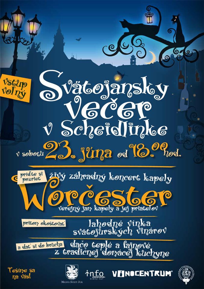 Svätojurský vinohradnícky spolok v spolupráci s Infocentrom, Mestom Svätý Jur a ViNOCENTROM Vás pozýva dňa 23. júna od 18:00 hod do Scheidlinovej záhrady vo Svätom Jure na živý záhradný koncert kapely Worčester. Pri muzičke okoštujete svätojurské vínka a zajete si dačo teplé a fajné z tradičnej domácej kuchyne. VSTUP VOĽNÝ.