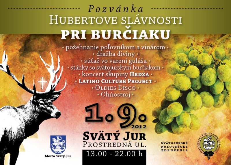 Mesto Svätý Jur v spolupráci so Svätojurským vinohradníckym spolkom a poľovníckymi združeniami Vás pozýva dňa 1. septembra 2012na Hubertove slávnosti pri burčiaku – súťaž vo varení guláša spojená s ochutnávkou burčiakov svätojurských vinárov a dražbou diviny (Prostredná ulica). Program spestrí kapela HRDZA a LATINO CULTURE PROJECT.