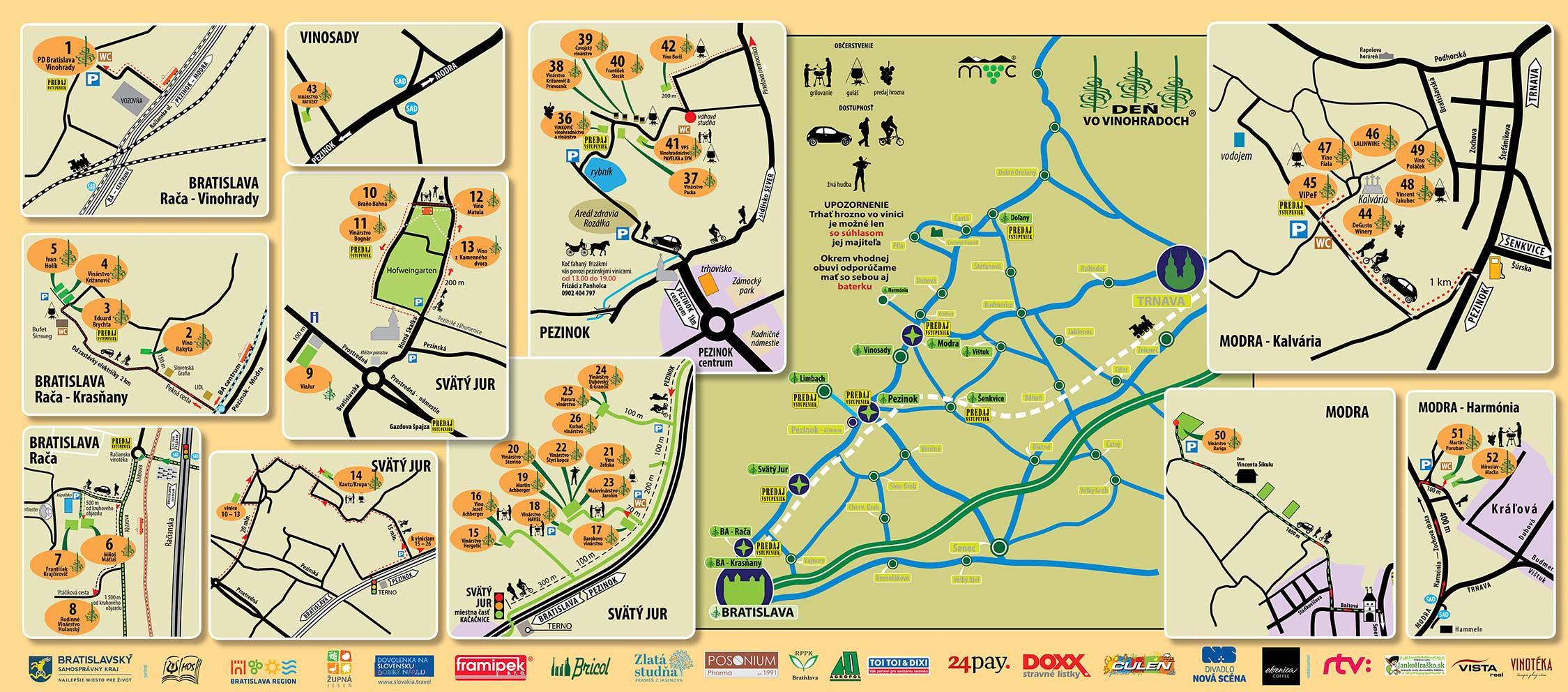 68 vinárov ponúkne svoje vína vo viniciach od Rače cez Svätý Jur, Limbach, Pezinok, Vinosady, Modru, Šenkvice, Vištuk a Doľany. Súčasťou vstupenky je mapka, ktorá Vám uľahčí vaše putovanie. Vinári volili najkrajšie miesta vinohradníckych chotárov a tam budú vína ponúkať spoločne, stačí si vybrať, ktorý navštívite: Hon Šinveg a Genofond Frankovky modrej v Rači, Hofweigarten za hradbami mesta v Svätom Jure, Hasensprung v Limbachu, Kamenica na Starej Hore v Pezinku, pod Kalváriou v Modre, ulička šenkvických vinárov vo vinici Kozare….