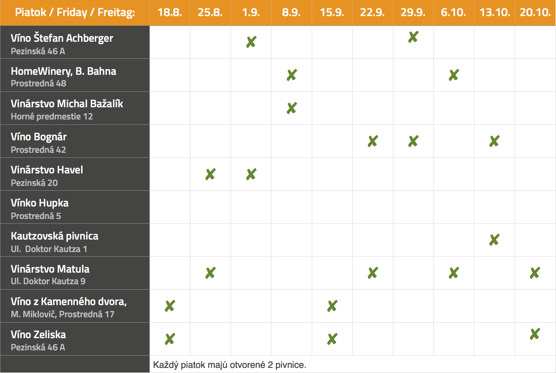 Ako za starých čias. Posedenie s priateľmi pri dobrom vínku pod viechou. Aj keď sa vytratili z centra mesta, nie z jeho periférie a okolia. Nasadnite, ako za starých čias. Každý piatok o 18:00 do 23:00 h.