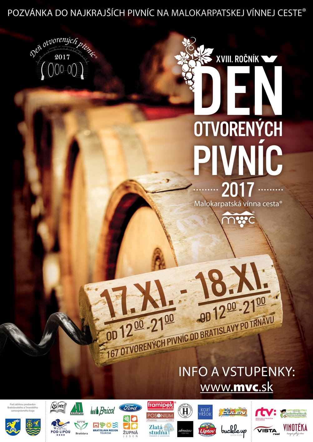 Svätojurskí vinári Vás pozývajú do svojich pivníc! 17. – 18. novembra 2017 sa koná 18. ročník podujatia Deň otvorených pivníc. Cena dvojdňovej vstupenky je 50€, v cene je bonus na nákup vína v hodnote 25€. PIVNICE BUDÚ OBIDVA DNI OTVORENÉ V ČASE OD 12.00 – 21.00 h.
