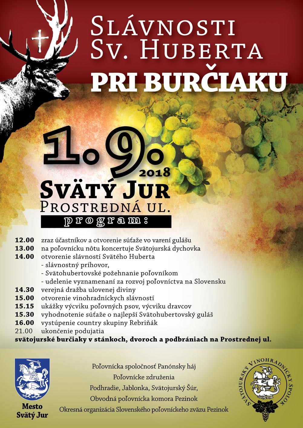 Priatelia svätojurského vína, pozývame Vás do svojich vinohradov ochutnať hrozno, mušty, burčáky a vina počas 9. ročníka podujatia Deň vo vinohradoch, ktorý organizuje združenie Malokarpatská vínna cesta. Tešia sa na Vás Víno Zeliska, Števino–Štefan Achberger, Vinárstvo Štyri kopce, Braňo Bahna, Vinárstvo BOGNÁR, Víno Matula, Ing. Andrej Kukumberg – ViaJur , Vinárstvo Havel, Vinárstvo Dubovský & Grančič, Milan Blahovský a Víno z Kamenného dvora.