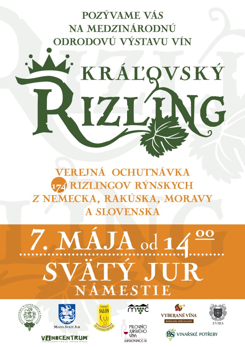 dovoľujeme si Vás pozvať 7. mája 2016 na 26. ročník výstavy vín vo Svätom Jure, ktorá tohto roku zaznamenala výraznú novinku: súťaž a následná výstava – je zameraná na vína výlučne z odrody Rizling rýnsky a nesie sa preto pod názvom Kráľovský rizling. Naša výstava aj naďalej patrí medzi nominačné výstavy do NSV SR. Veríme, že aj Vaše súťažné vzorky prispejú k mozaike vytvorenej z rozmanitosti podôb tejto „kráľovskej“ odrody.
