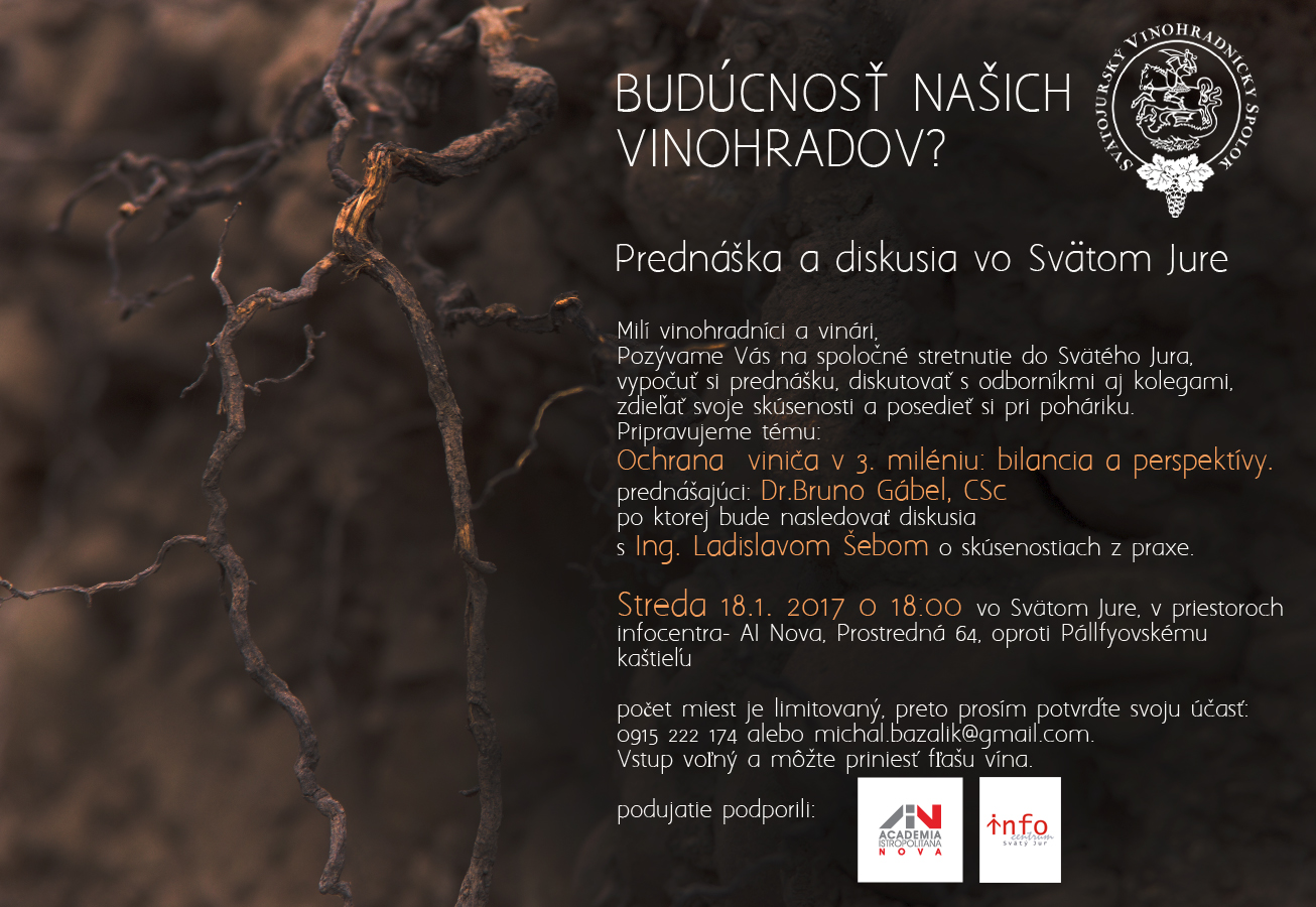 Milí vinohradníci a vinári, radi by sme Vás pozvali na prednášku s diskusiou o ochrane viniča, ktorá bude v stredu 18.1. 2017 o 18:00 v Infocentre AINova (Prostredná 64, Svätý Jur).