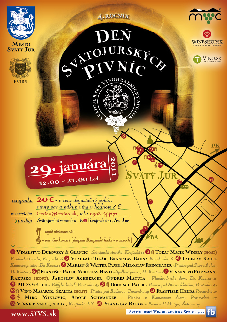 pozývame Vás dňa 29. 1. 2011 na 4. ročník Dňa Svätojurských pivníc, ktorý pre Vás pripravuje Svätojurský vinohradnícky spolok a mesto Svätý Jur. V tomto ročníku nám vzrástol počet pivníc na 14 a pribudli tiež nové mená domácich majstrov – vinárov. Čítaj viac