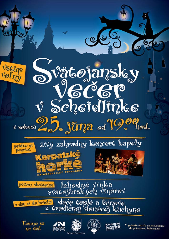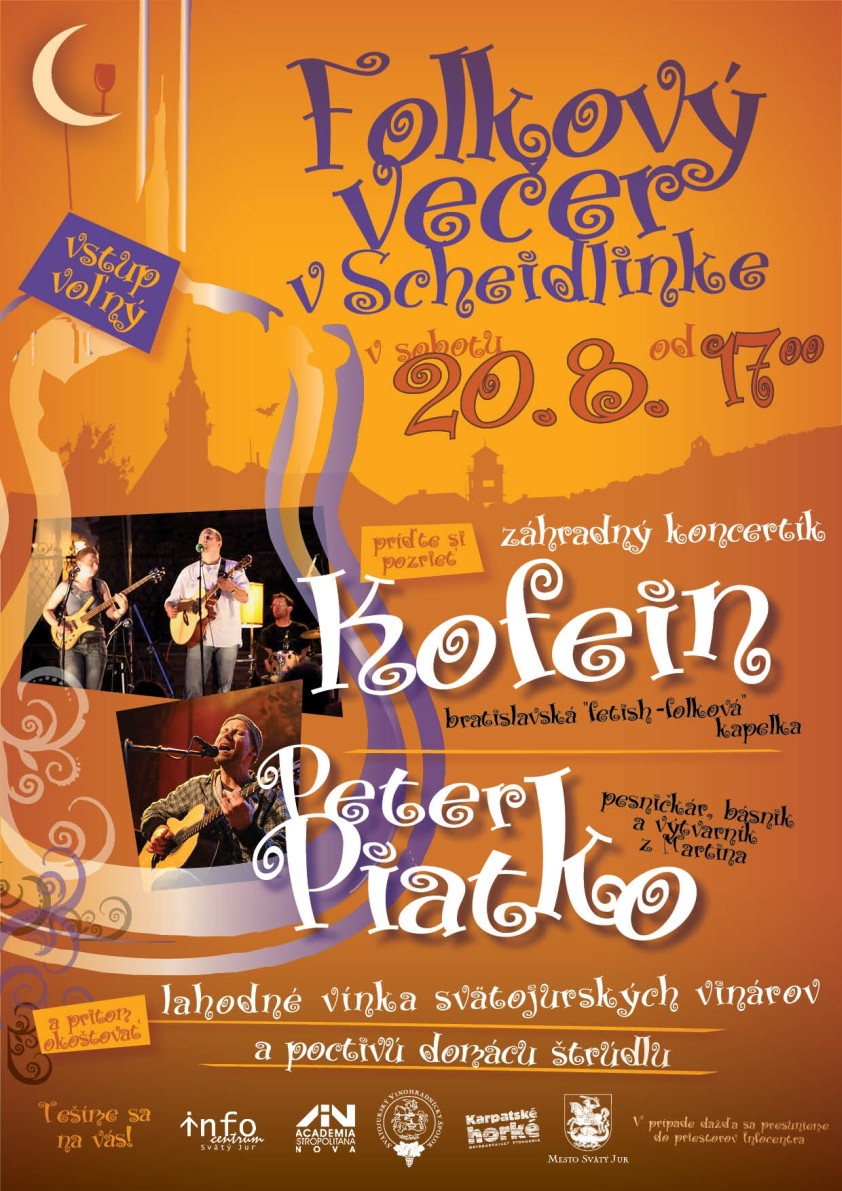 Svätojurský vinohradnícky spolok v spolupráci s Infocentrom, AINovou, kapelou Karpatské Horké a Mestom Svätý Jur Vás pozýva dňa 20. augusta od 17:00 hod do Scheidlinovej záhrady vo Svätom Jure na živý záhradný koncertík kapely KOFEIN (bratislavská fetish-folková kapela) a vystúpenie PETRA PIATKA (pesničkár, básnik a výtvarník z Martina). Pri muzičke okoštujete lahodné svätojurské vínka a poctivú domácu štrúdľu. VSTUP VOĽNÝ.